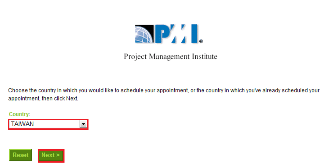 2. 選擇考試的區域 ─ 將Country的部分選擇"TAIWAN" ,再點選Next